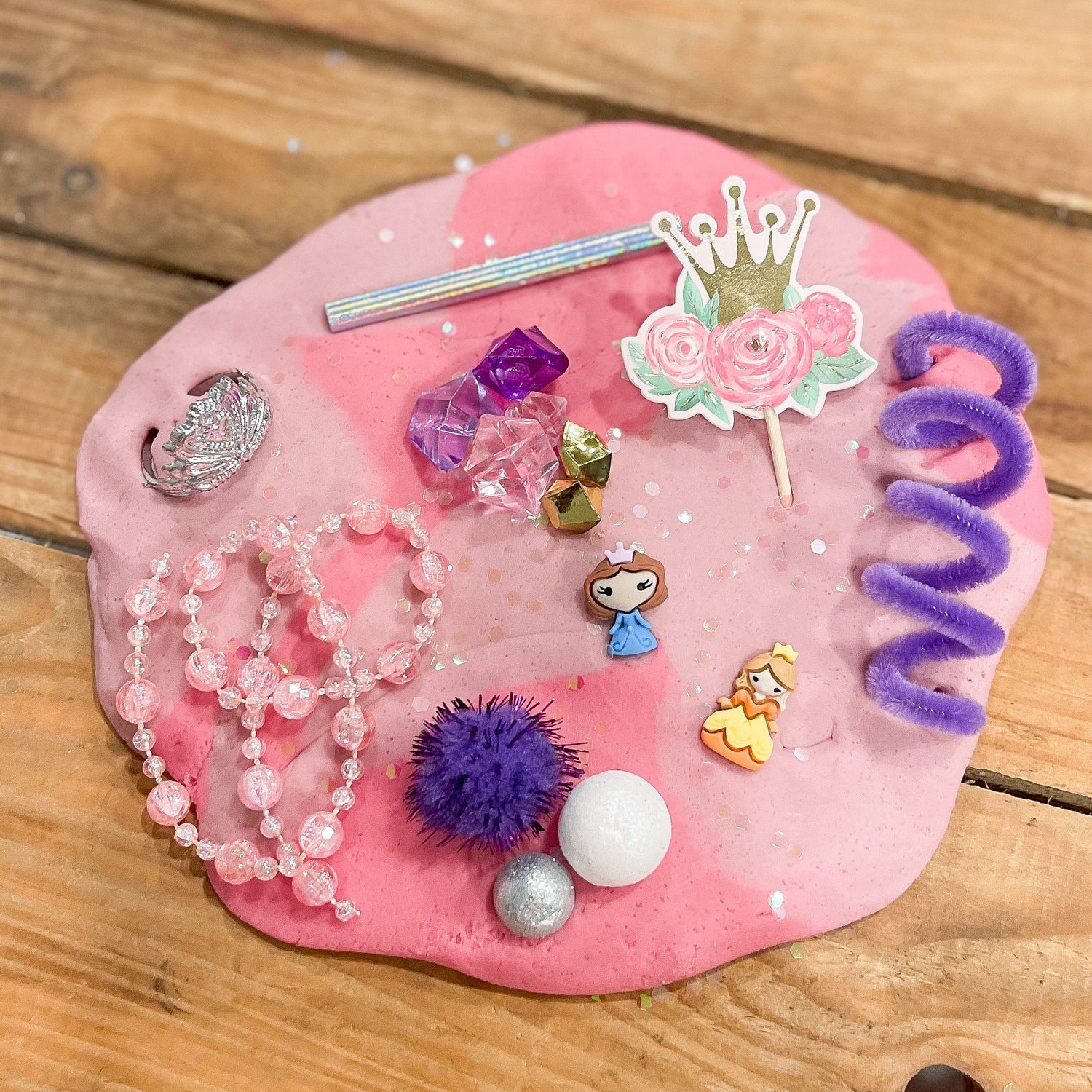 This princess themed Doughie Jar is sure to get your little one playing & is just so darling! This kit contains playdough and fun goodies for hours of fun! Let your little ones imagination blossom as they play with princesses, tiaras, beads, jewels and more.