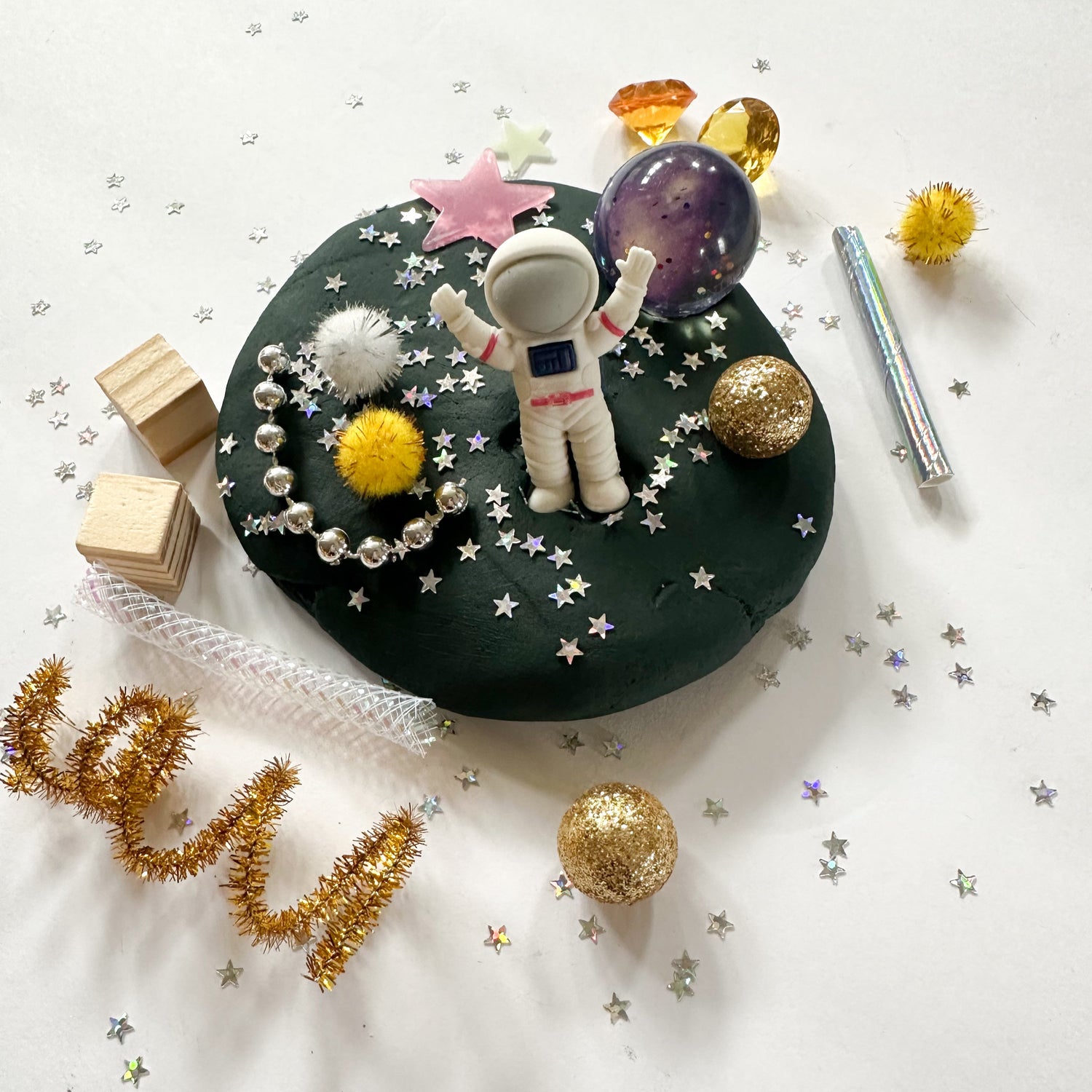 This Space Doughie Jar is sure to get your little one playing! This kit contains playdough and fun goodies for hours of fun! Let your little ones imagination soar to the stars with fun beads, jewels, space toys, and more.